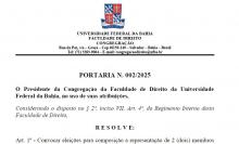 - Portaria 006/2025, convocando eleição para escolha de representação na classe de Professor/a Titular na Congregação da Faculdade de Direito da UFBA. <<<Clique aqui>>>